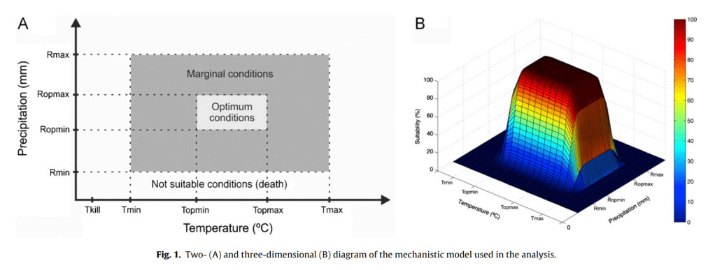 Este enfoque de modelo tiene en cuenta los rangos agroclimáticos de la precipitación, temperatura máxima, temperatura media y temperatura mínima, siguiendo los límites óptimos, marginales y de muerte, tal como lo ilustra la siguiente figura del artículo.