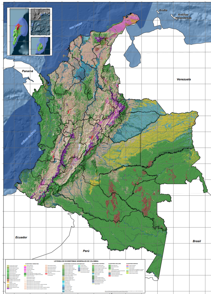 Mapa de ecosistemas continentales, marinos, y costeros de Colombia para el año 2017.