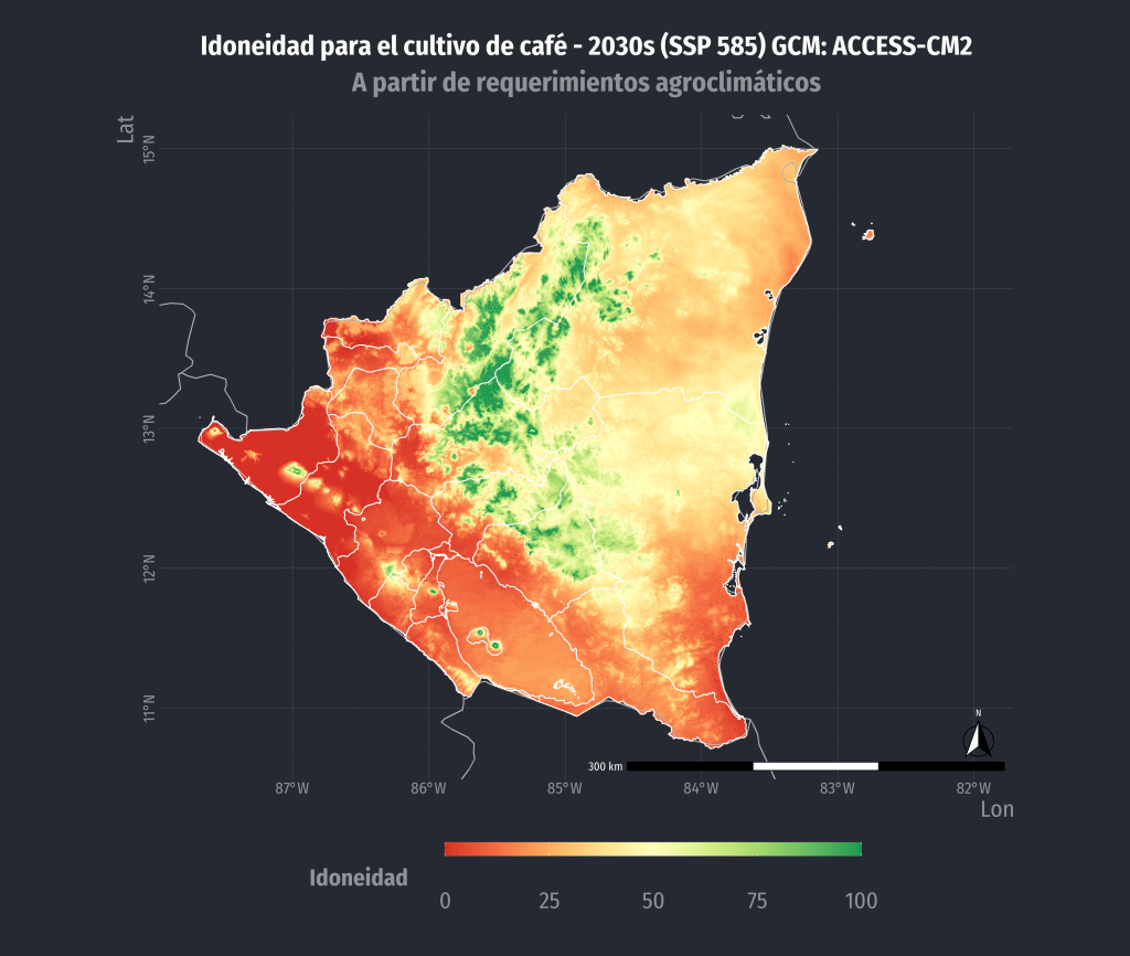 El presente tutorial es la continuación de un previo tutorial en el cual identificamos las zonas idóneas para el cultivo de café bajo la línea base, ahora bien, en esta ocasión realizaremos el análisis con datos de cambio climático. Dentro del mismo tutorial realizamos la descarga de los rasters de cambio climático con el SSP 585 para el GCM ACCESS-CM2 y el periodo 2021- 2040.